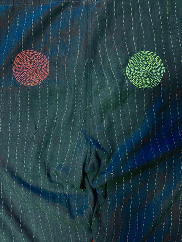 A traditional Japanese garment, samue, is decorated with a flower pattern from the Karen tribe in Thailand and original embroidery inherited .